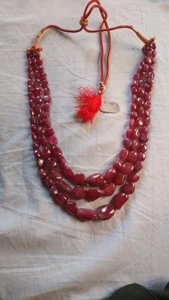 A beautifully handcrafted ruby bead necklace featuring rich, deep-red gemstones that sparkle with natural elegance. Perfect for weddings, parties, and gifting, this luxurious accessory adds timeless charm, sophistication, and a bold, graceful statement to any outfit.