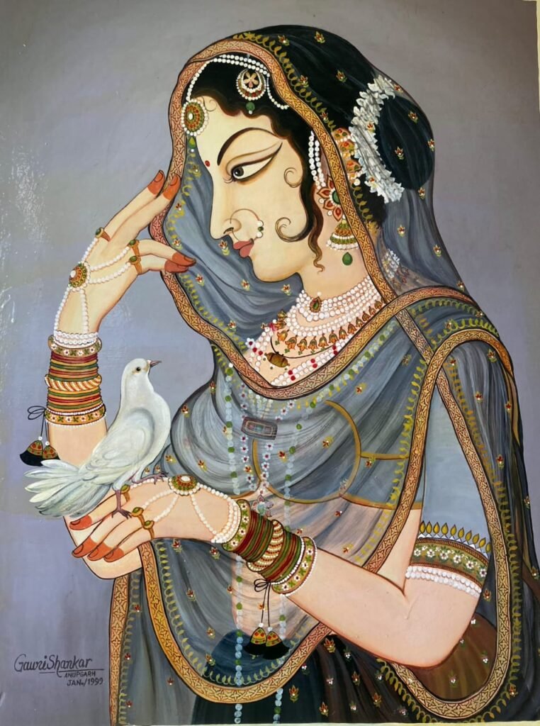 Kishangarh Style Bani Thani (1999) is a world-famous oil painting known for its graceful features, fine detailing, and elegant Mughal-Rajput aesthetic. Masterfully executed, it showcases exceptional artistry and the timeless beauty of traditional Kishangarh miniature style.